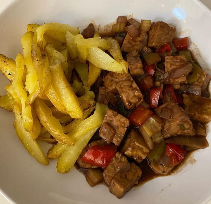 ➡️Cortamos el tempeh en cuadrados, macéranos 1/2 hora en : pimentón, aceite de sésamo, especia de humo, soja y especias para pollo.
