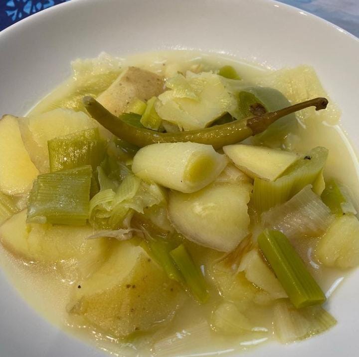 ➡️️Se cortan los puertos en tacos grandes y la patata en trozos.