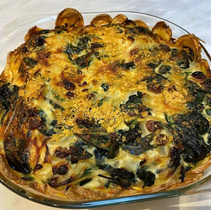 5️⃣En una sartén con aceite hacer las espinacas con ajo, cebolla, sal, pimienta y las pasas.
