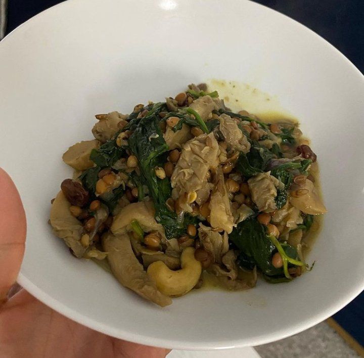 ➡️Poner un poco de ghee en una sartén y hacer las setas con la cebolla y los anacardos.